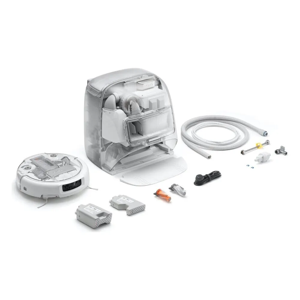 Робот-пылесос DJI ROMO P ×1; Базовая станция (автоподача/слив) ×1; Базовая пластина ×1; Шнур питания ×1; Очиститель для дезинфекции ROMO ×1; Антибактериальная жидкость ROMO ×1; Роликовая щётка с резиновой щетиной ×1; Комплект автоматической подачи и слива воды ×1