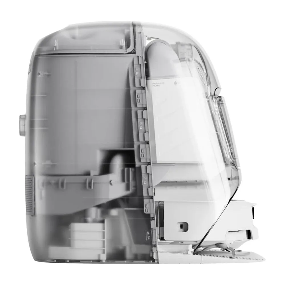 Главное отличие этой версии — полностью автономная станция. Она подключается к водопроводу и канализации, самостоятельно промывает и сушит швабры, подаёт чистую воду, сливает грязную и очищает контейнер пыли в герметичный пылебокс. Благодаря этому обслуживание сводится к минимуму: доливать воду и выносить мусор нужно лишь раз в несколько недель.